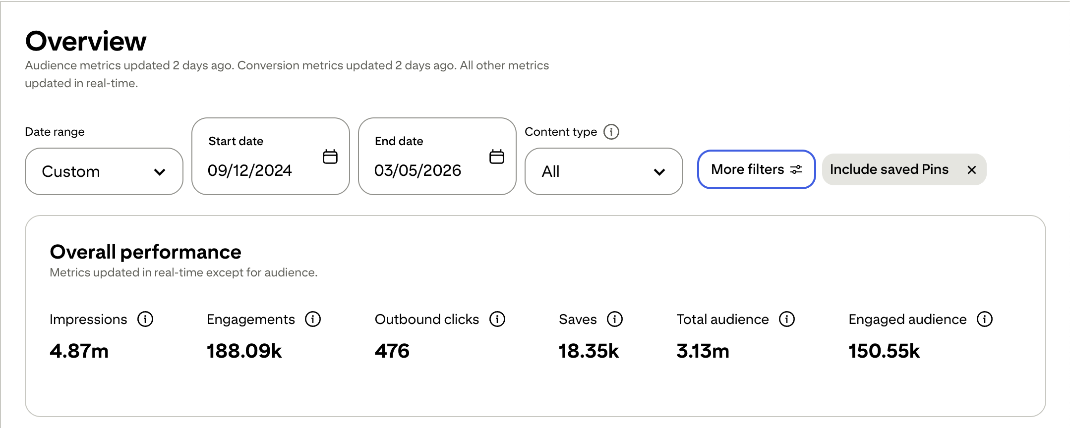 As of 2026, my Pinterest strategy has scaled to 1.6+ million monthly views, generating 4.87 million impressions, 1.6k followers, and 163.5K engaged audience members. By continuously analyzing performance metrics and optimizing content around high-performing topics, I was able to build a highly discoverable profile that consistently attracts and engages a large audience organically.