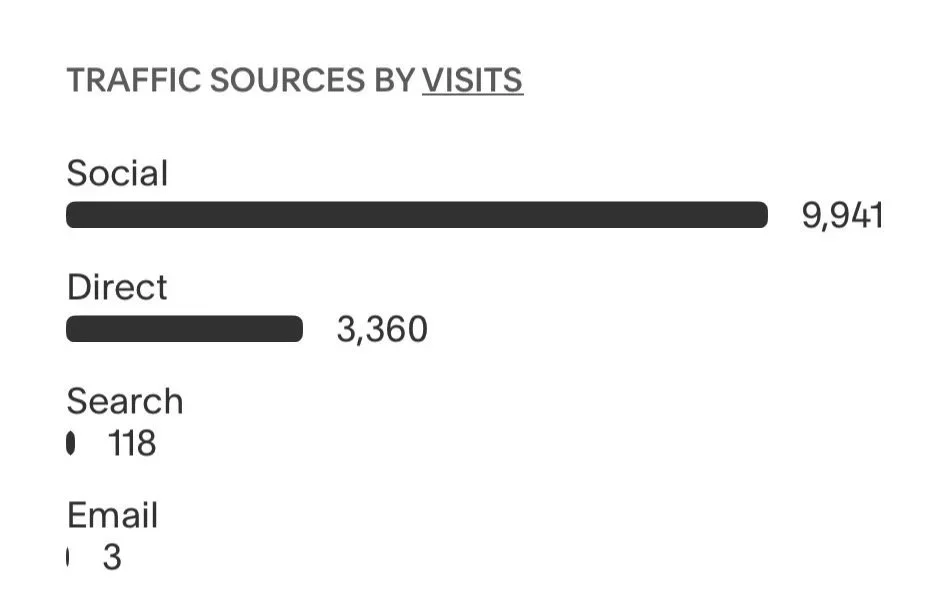 Within approximately five months, the website generated 13,424 visits and 12,940 unique visitors, with the majority of traffic driven directly from social media platforms. Social channels accounted for 9,941 visits, making it the leading source of website traffic.